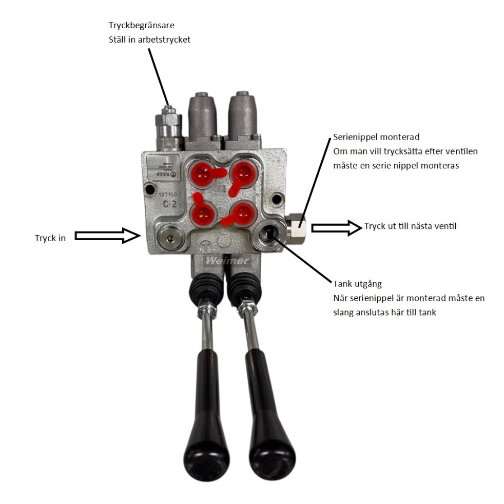Vill man ta ut tryck efter denna ventilen så monterar man en serie nippel, där tar man ut tryck. Man måste också montera en retur slang i tank porten.