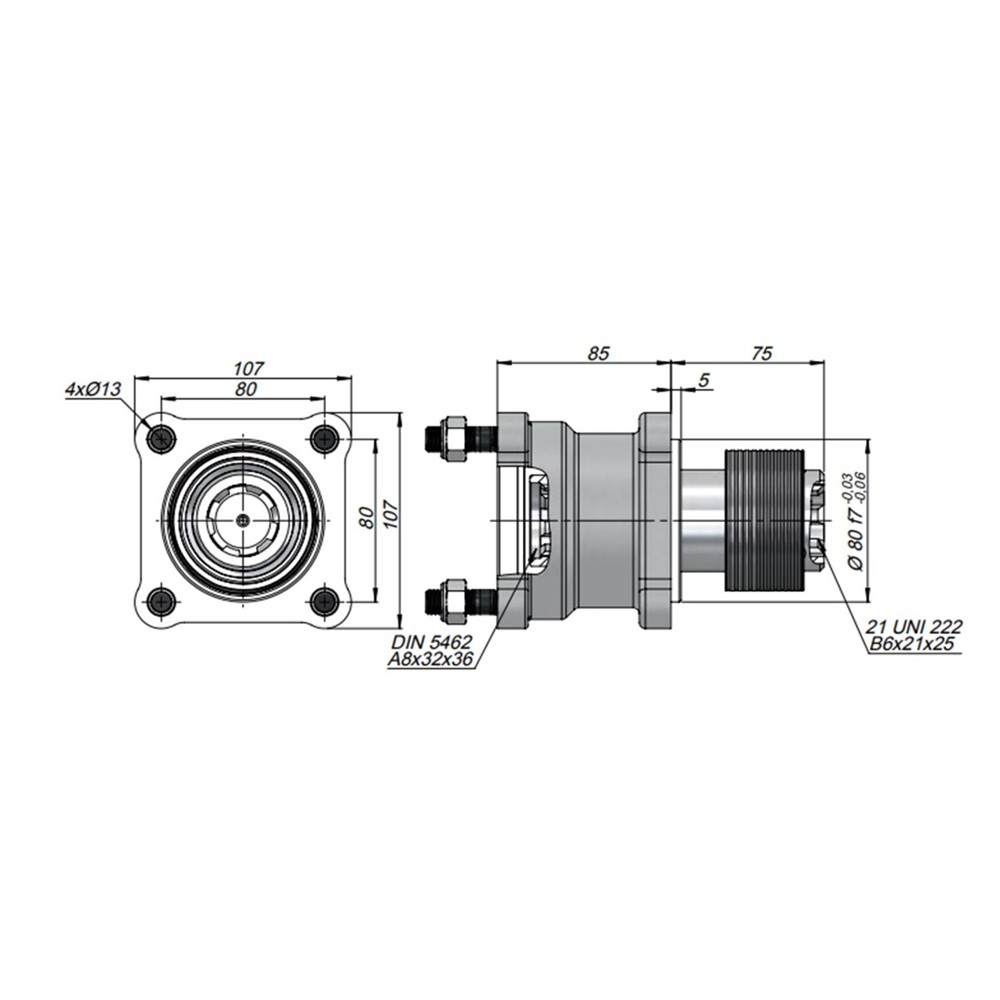 Stödlager för kolvpump ISO 7653, 80x80 mm och axel DIN 5462, splines 8x32x36.Inkoppling mot invändig PTO 6 splines 1 3/8" med låsning